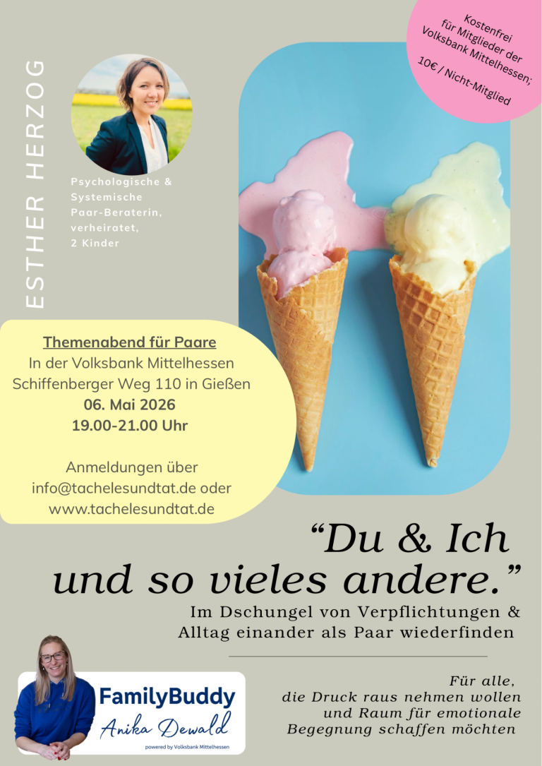 In Kooperation mit der Volksbank Mittelhessen und dem "FamilyBuddy" sind alle interessierten Paare herzlich eingeladen eine kleine Auszeit zu nehmen und den eigenen Alltag ungter die Lupe zu nehmen. Was stresst uns? Was lässt sich ändern? Wo und wie möchten wir uns wieder mehr Zeit füreinander nehmen ? Warum ist unsere Kommunikation so oft erschwert und wie schaffen wir ehrliche Begegnung miteinander zu erhalten?